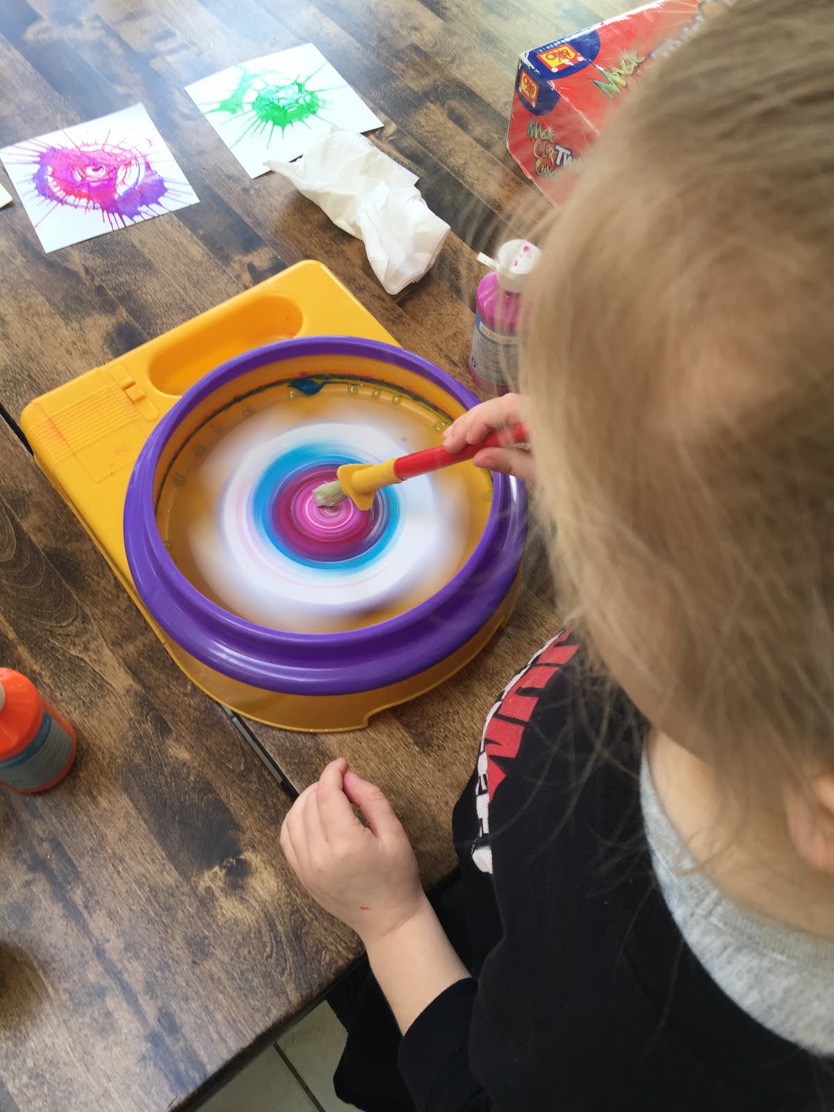 Dakota was having a fever free moment and she asked to paint. We did some regular painting on paper and then I decided to pull out the twirl o paint, a toy that was originally Zoe's and still works perfectly!
